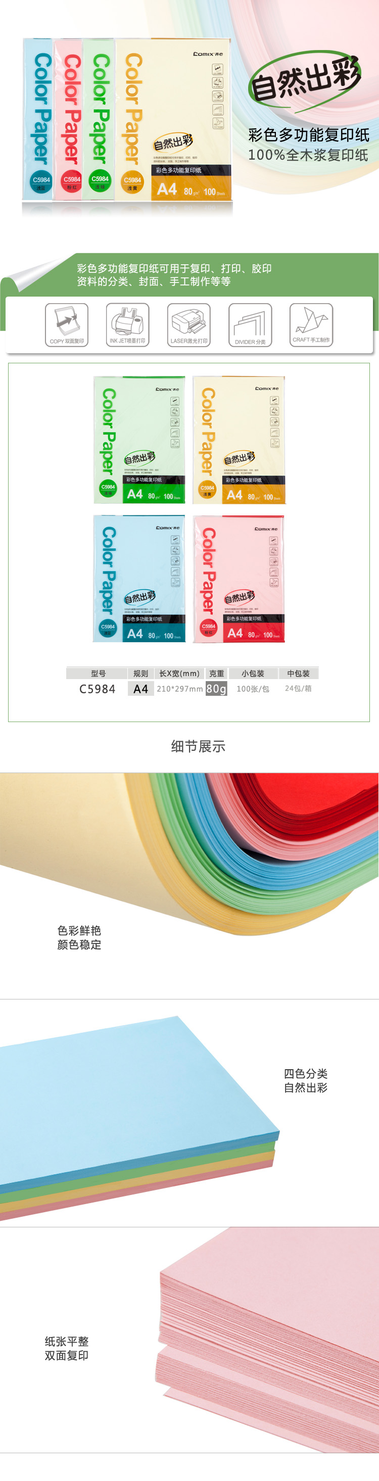 商品名称:齐心 C5984-24 A4 80g 彩色多功能复印纸 粉(100张/包)(单位:包)