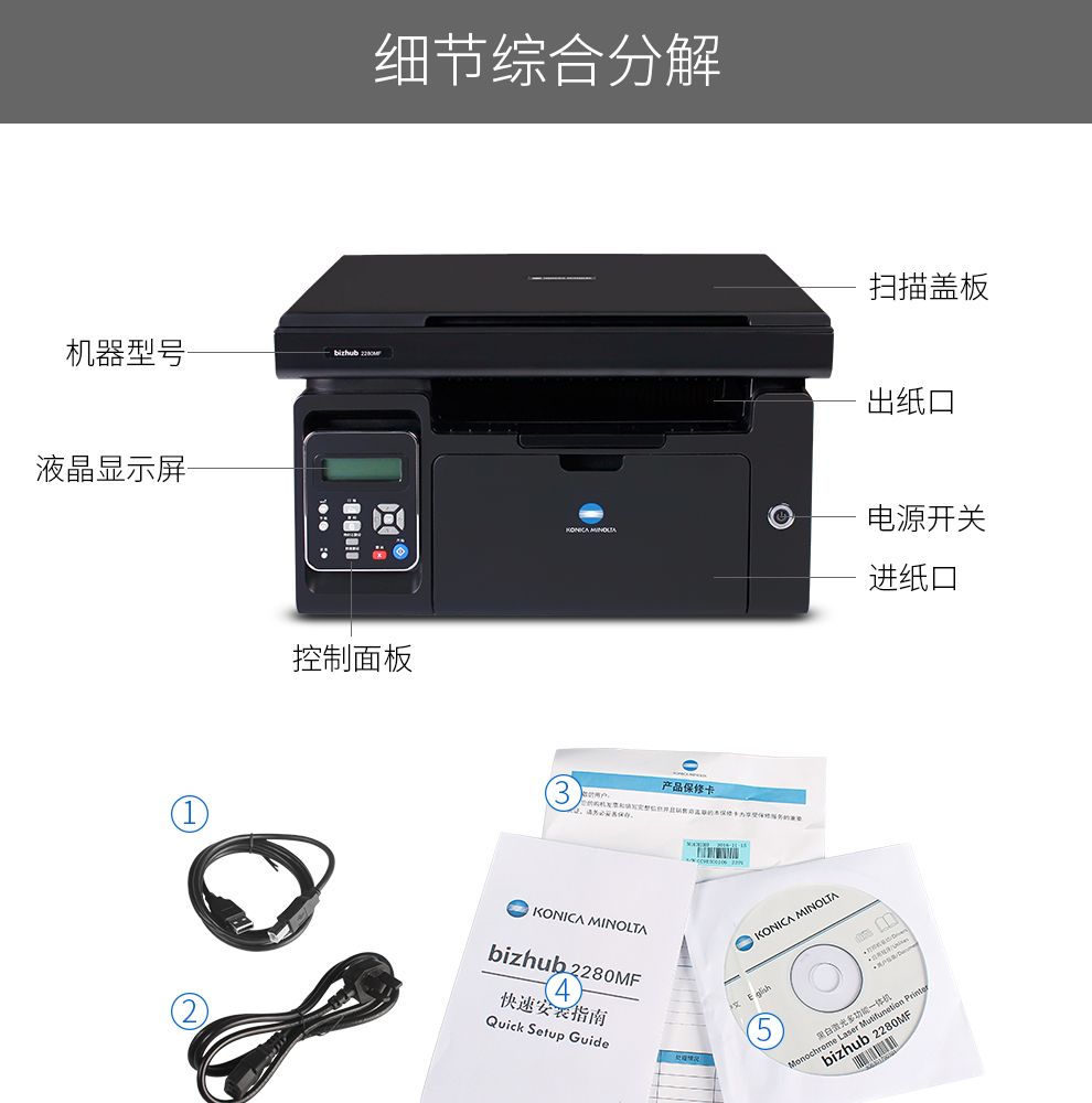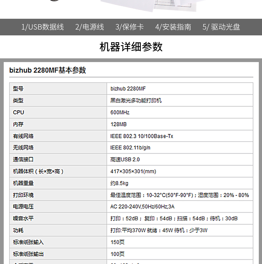 - 商品名称:柯尼卡美能达2280MF黑白激光A4无线wifi多功能一体机打印机复印扫描三合一办公商用家用小型 标配(主机+数据线+驱动光盘+保修卡+墨粉组件)