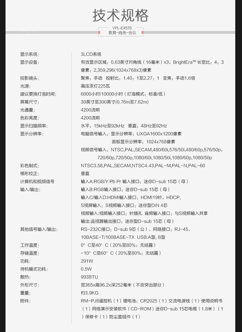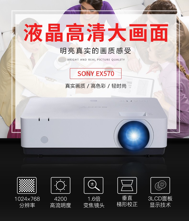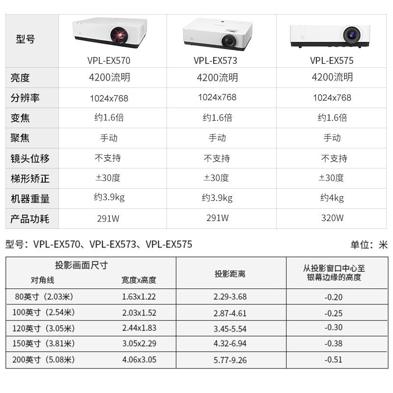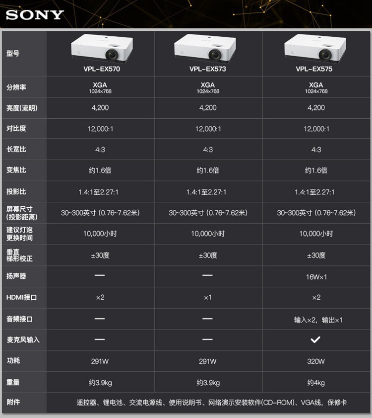 索尼(SONY) VPL-EX570 投影仪 高清商务 办公家用教学投影机(标清 双HDMI4200流明) 标配+英微120英寸纤维电动幕+上门安装