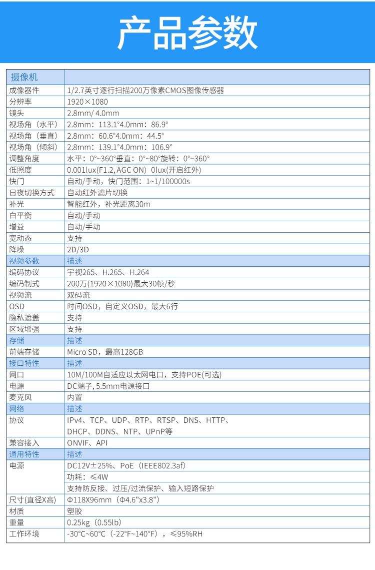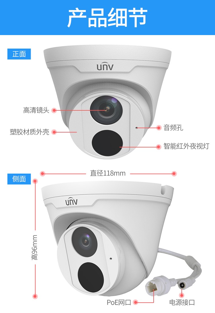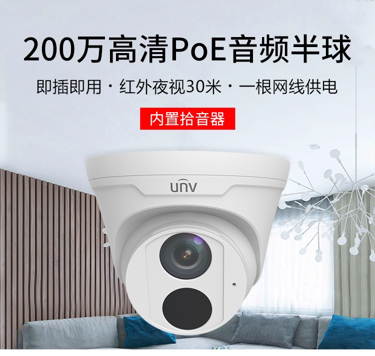 商品名称:宇视科技(uniview)200万带音频焦距2.8mm 监控摄像头 高清红外数字探头内置拾音器监控套装poe供电网络半球 200万音频半球