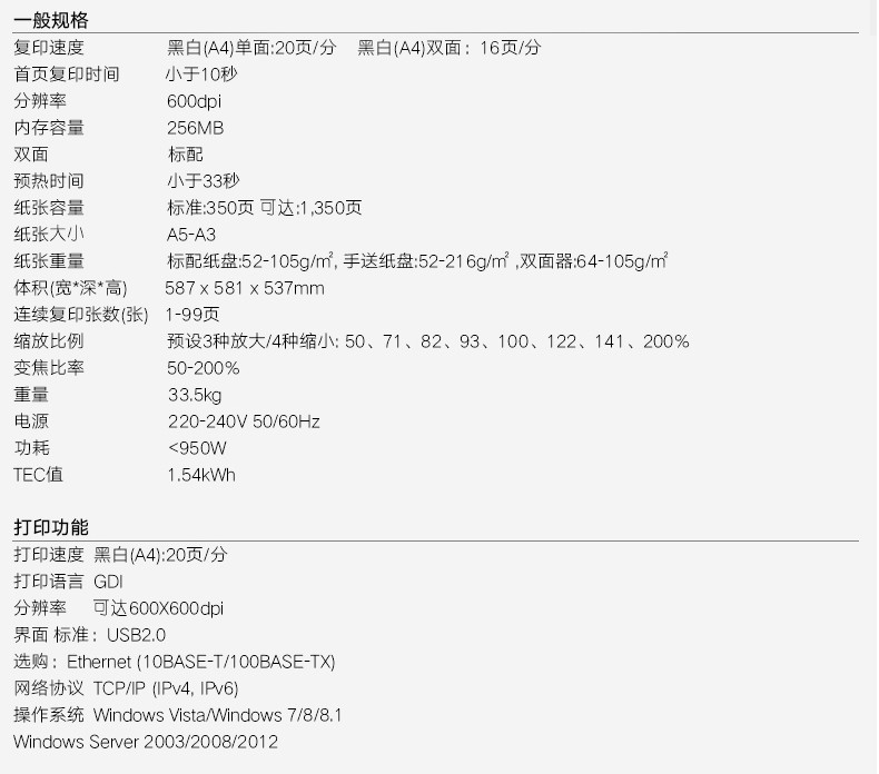 黑白(A4)单面:20页/分