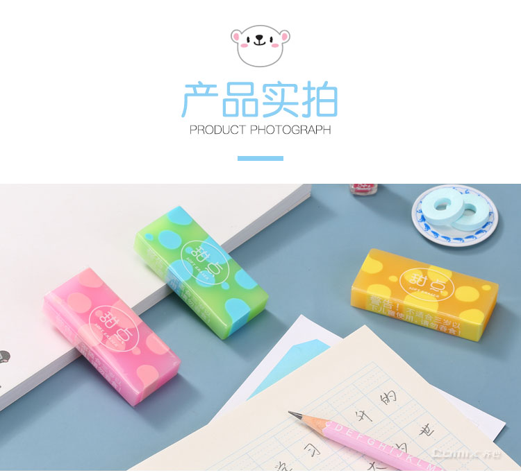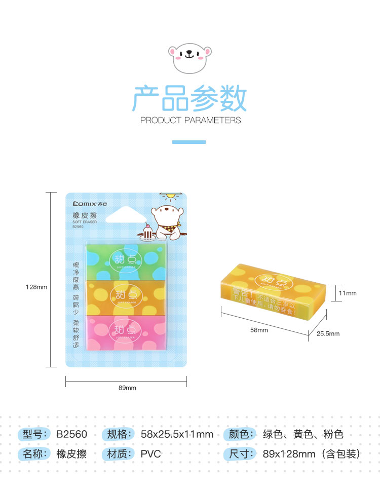 - 商品名称:齐心(Comix) 3块/盒 作业考试美术绘图彩色橡皮擦(配)点点 B2560