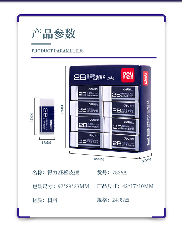 商品名称:得力(deli)24块净白2B橡皮擦 易擦少屑 简约办公 学生考试 美术绘图橡皮 铅笔用7536A
