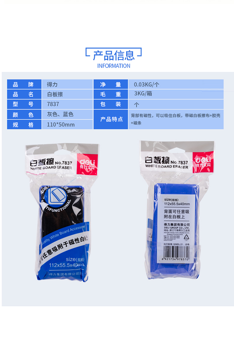 商品名称:得力(deli) 112*55*40mm白板磁性白板擦背面吸附黑板擦 颜色随机白板配件 白板笔 可用7837
