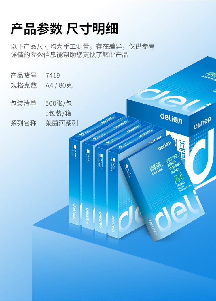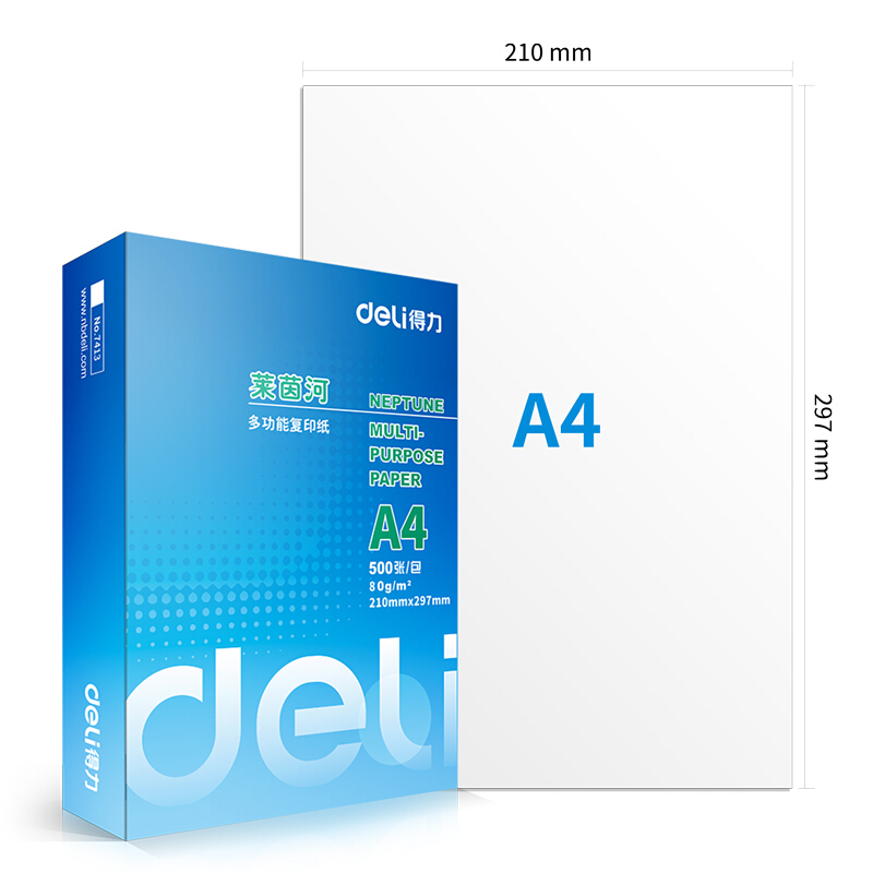 商品名称:得力(deli)莱茵河 80g A4 复印纸 中高档打印纸 500张/包 5包1箱(整箱2500张)