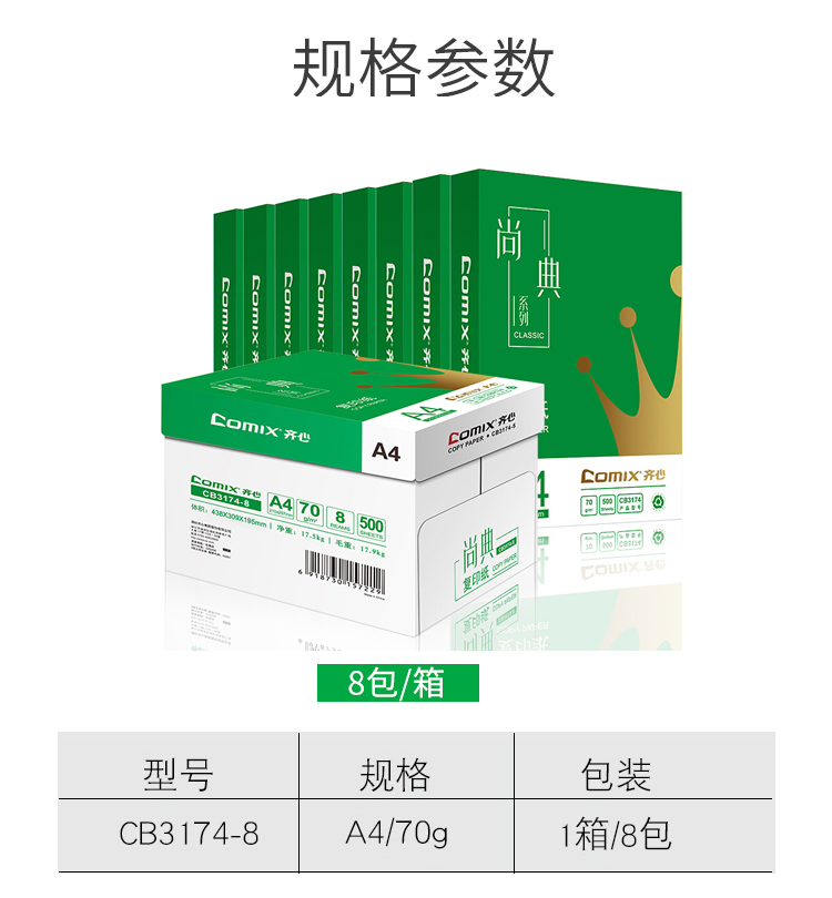 - 商品名称:齐心(Comix)尚典 70g A4 复印纸 500张/包 8包/箱(4000张) CB3174-8