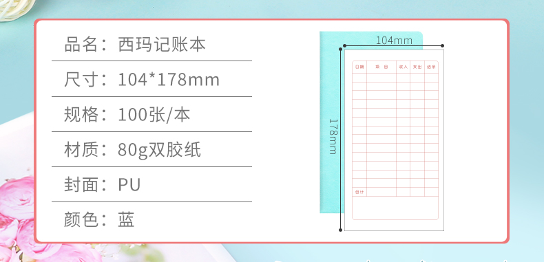 商品名称:西玛(SIMAA)A6手账本 现金日记账本家庭理财笔记本记账簿 日常开支记事本收入支出账本花销册蓝色JZB-A6蓝