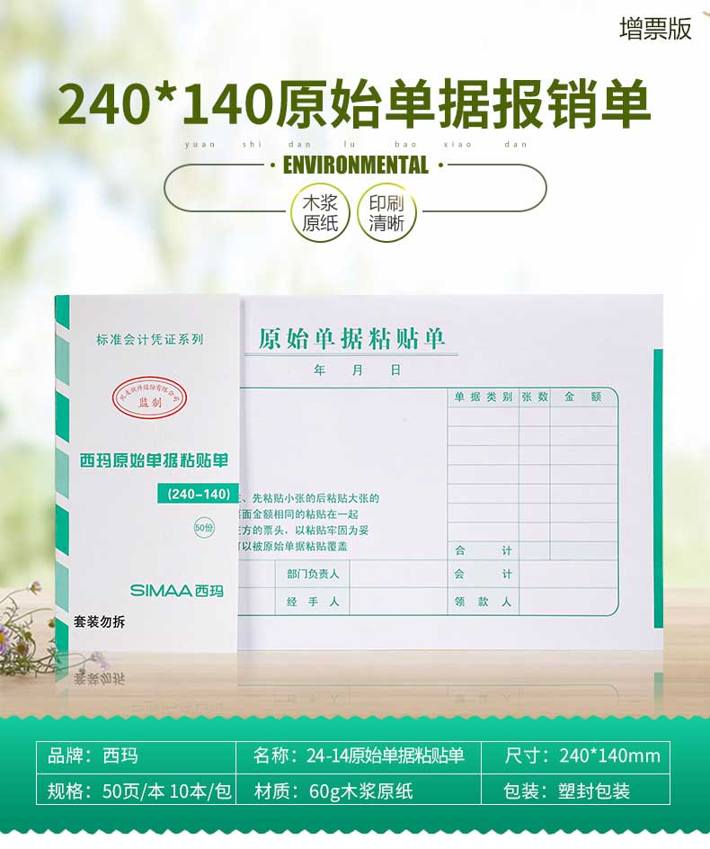 - 商品名称:西玛(SIMAA)原始单据粘贴单 240*140mm 50页/本10本/包 借款审批支出报销单据财务专用通用会计记账凭证纸