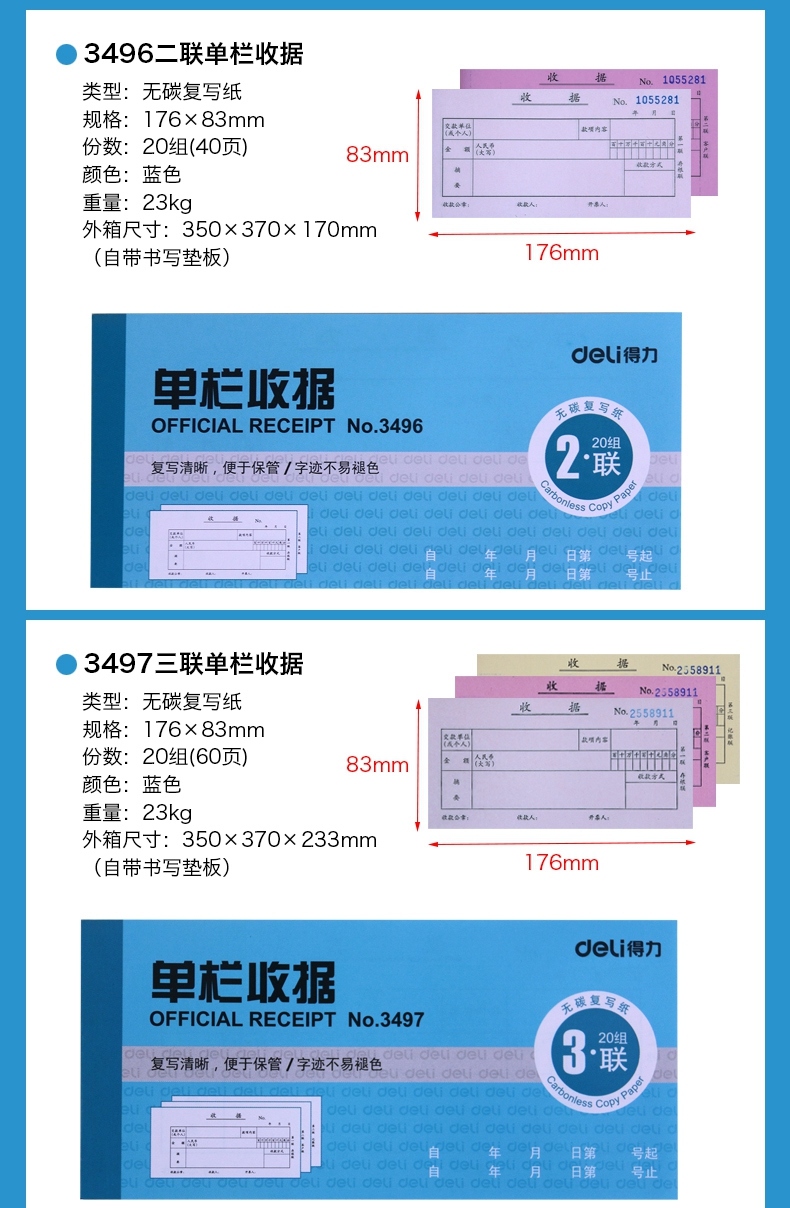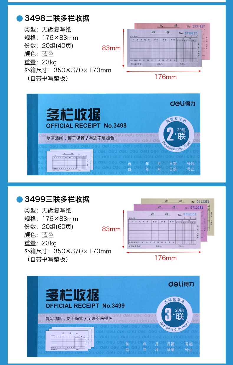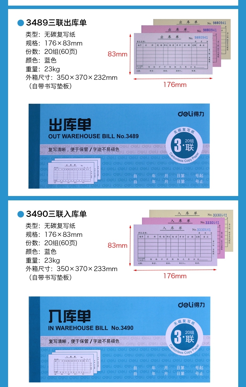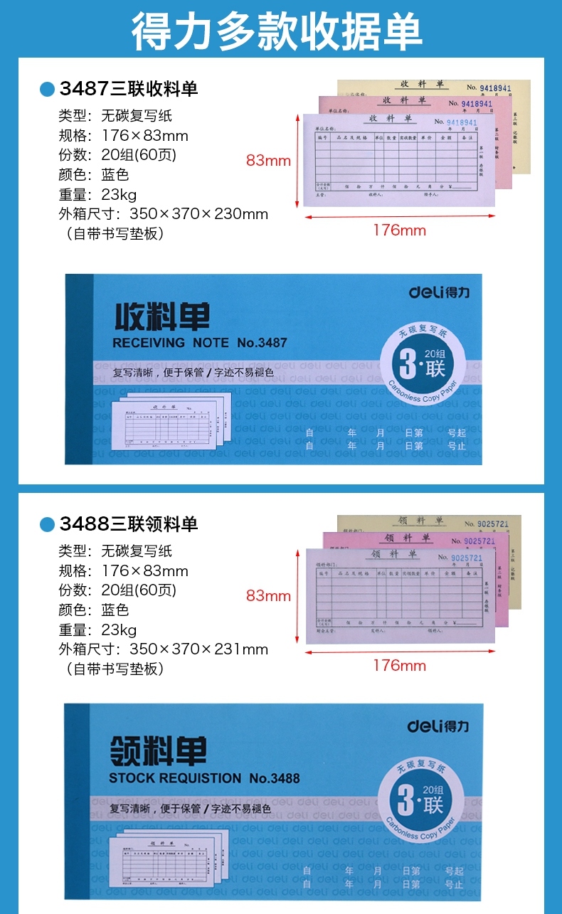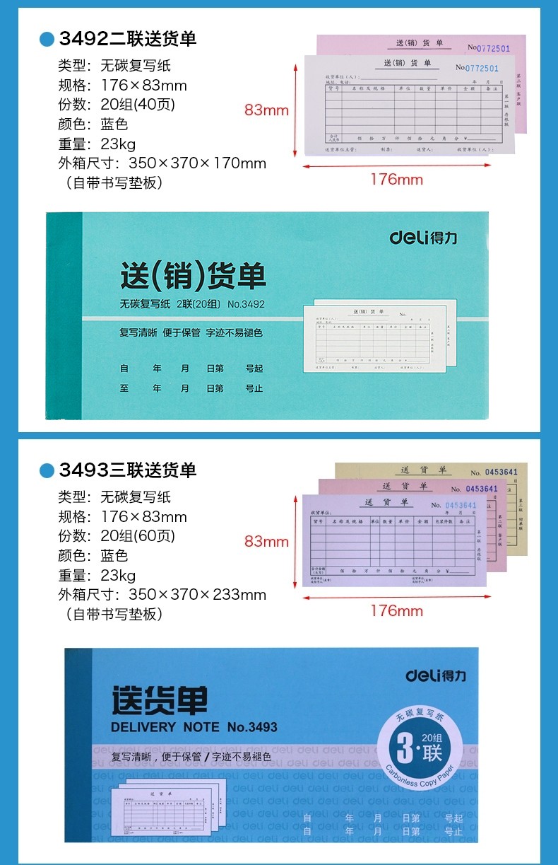- 商品名称:得力(deli)3492 无碳复写单据二联20组送货单复写清淅 二联送货单(蓝)【50本/组】