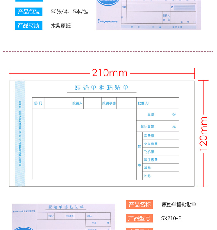 - 商品名称:金蝶 kingdee 费用报销单SX210-A通用财务手写单据210*120mm 5本/包