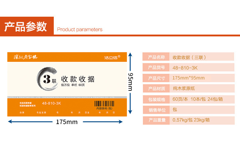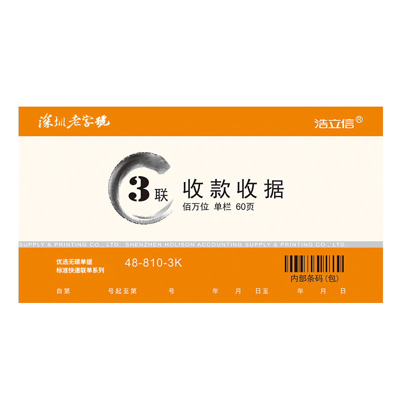 - 商品名称:浩立信 百万位单栏三联收款收据 财务单据 175*95mm 10本/包×60页/本 带撕裂线无碳复写 10本装1本20份