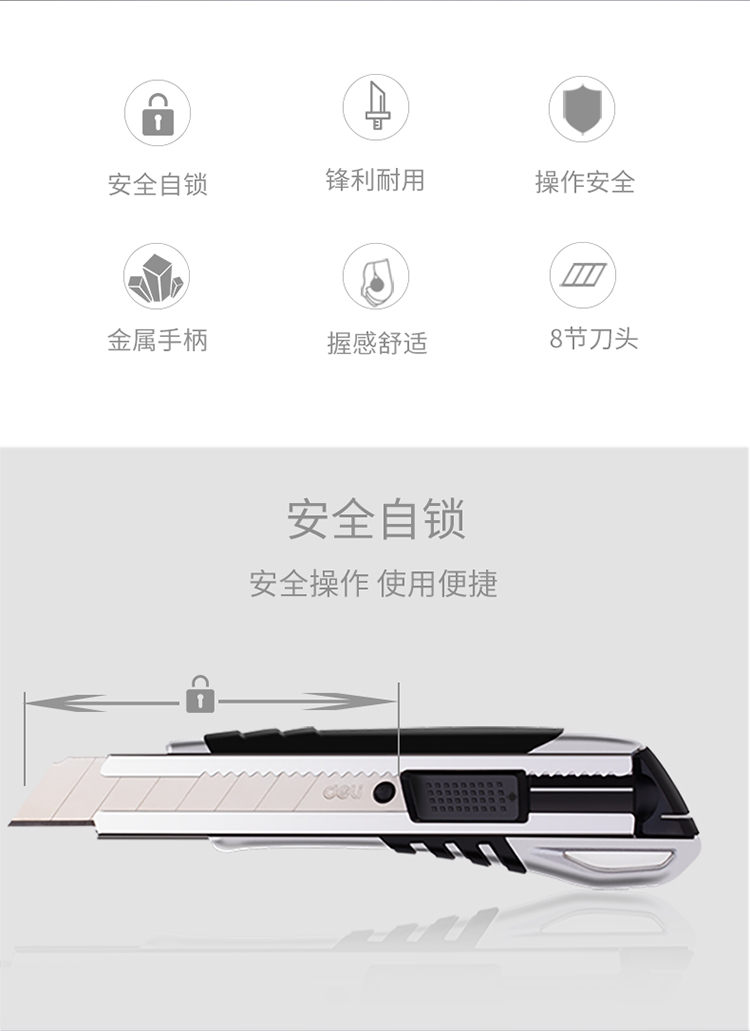- 商品名称:得力(deli)锌合金美工刀套装 裁纸刀1把+合金钢美工刀片1盒 办公用品 33416