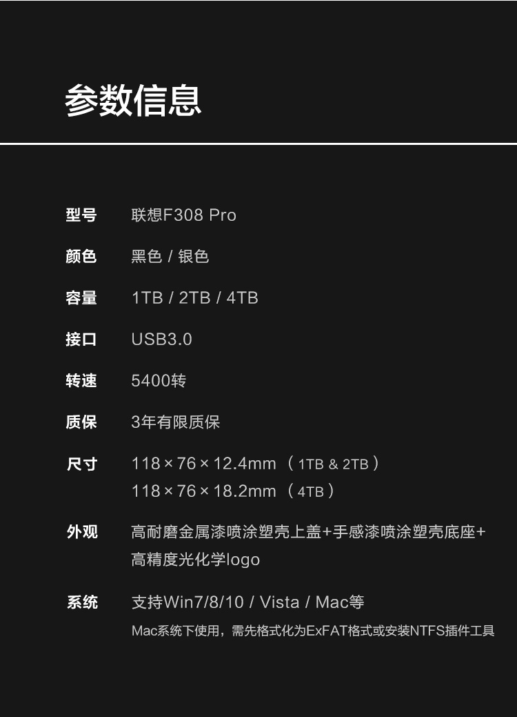 商品名称:联想(Lenovo)2TB 移动硬盘 USB3.0 2.5英寸 皓月银 高速传输 热卖爆款 稳定耐用 (F308 Pro 时尚沙纹)