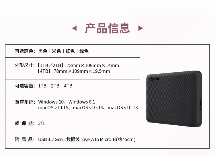 商品名称:东芝(TOSHIBA) 2TB 移动硬盘 V10系列 USB3.0 2.5英寸 酒红 兼容Mac 轻薄便携 密码保护 轻松备份 高速传输