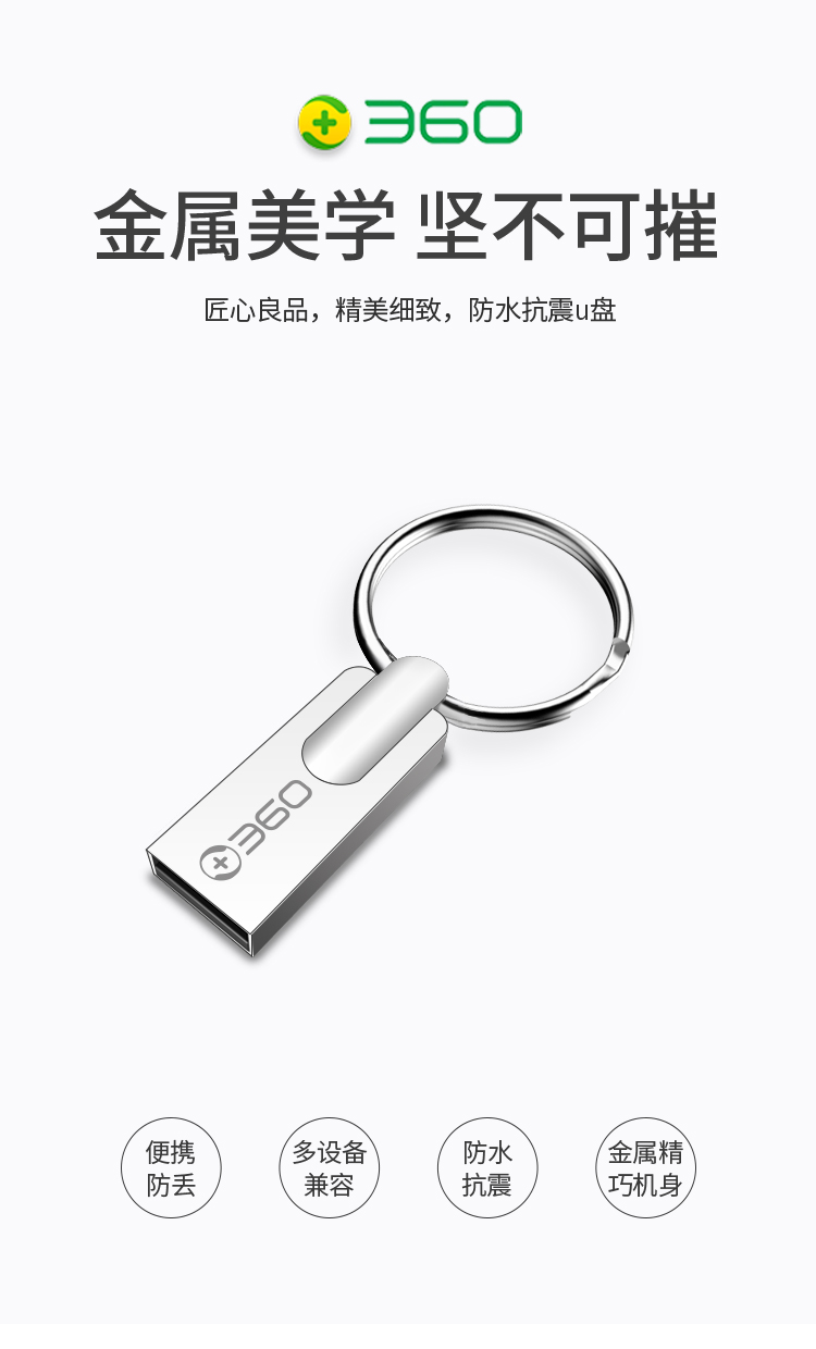 商品名称:360 16GB USB2.0 U盘 亮银 精品版 大钢环便携设计 防震防尘防水 全金属电脑车载办公优盘