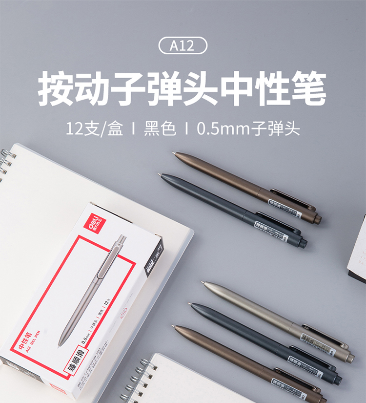 - 商品名称:得力(deli)乐素臻顺滑中性笔签字笔 0.5mm子弹头按动笔水笔 金属喷漆 黑色 12支/盒A12