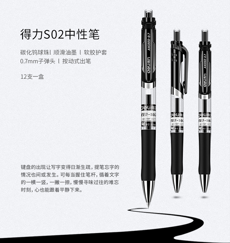 - 商品名称:得力(deli)中性笔签字笔 0.7mm子弹头按动笔水笔 办公用品 黑色 12支/盒 S02