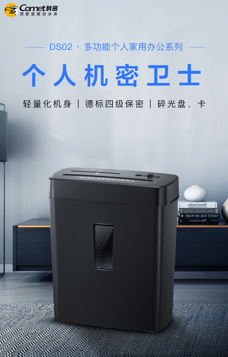 - 商品名称:科密(comet)4级保密办公家用碎纸机(单次8张 持续5分钟 15L 可碎卡、光盘、订书针)DS02
