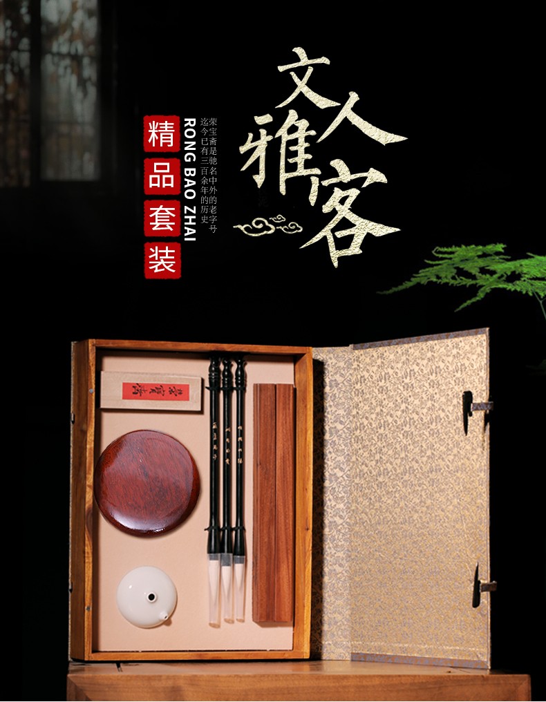 - 商品名称:荣宝斋 文房四宝套装 文人雅客 笔墨纸砚镇尺水滴套装 书法国画毛笔墨锭砚台 精选礼盒装