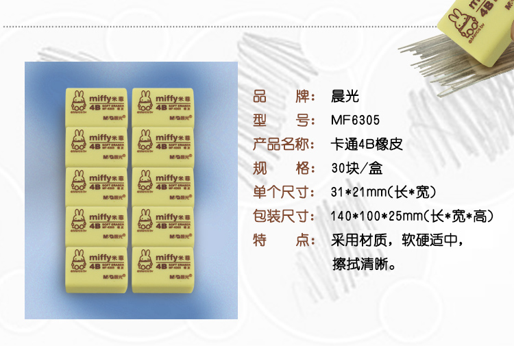 商品名称:晨光(M&G)文具米菲4B美术橡皮 学生美术考试绘图橡皮擦 办公学习用品 5块装黄色米菲MF6305小