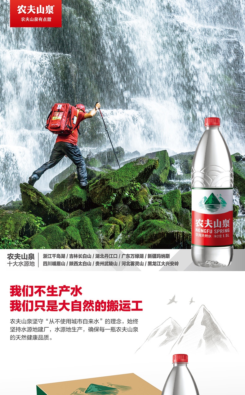 - 由于农夫山泉采取的是“水源地建厂,水源地灌装”、“水源地就近区域销售”的策略,各地购买到的农夫山泉水源地不尽相同,具体以瓶身标准为准