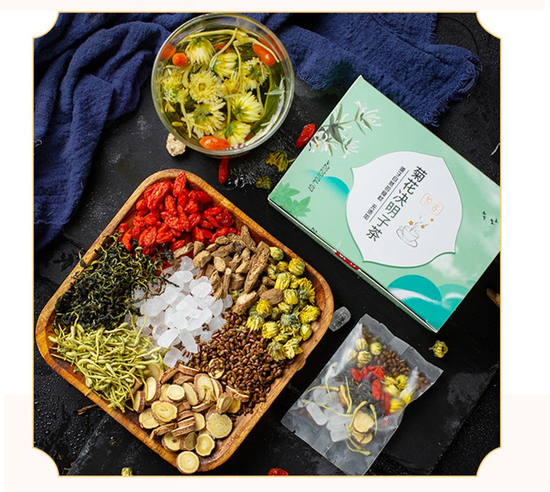 - 商品名称:枸杞菊花决明子金银花牛蒡根蒲公英甘草凉茶包桂花肝养护茶熬夜清理火去茶五宝茶花茶组合清口气臭茶火养生茶 菊花决明子茶
