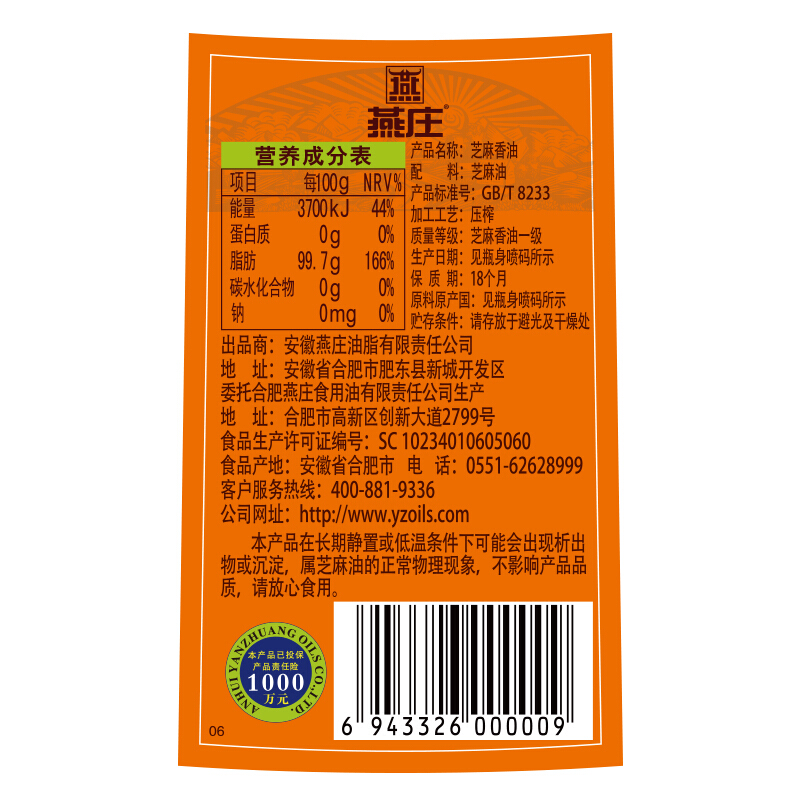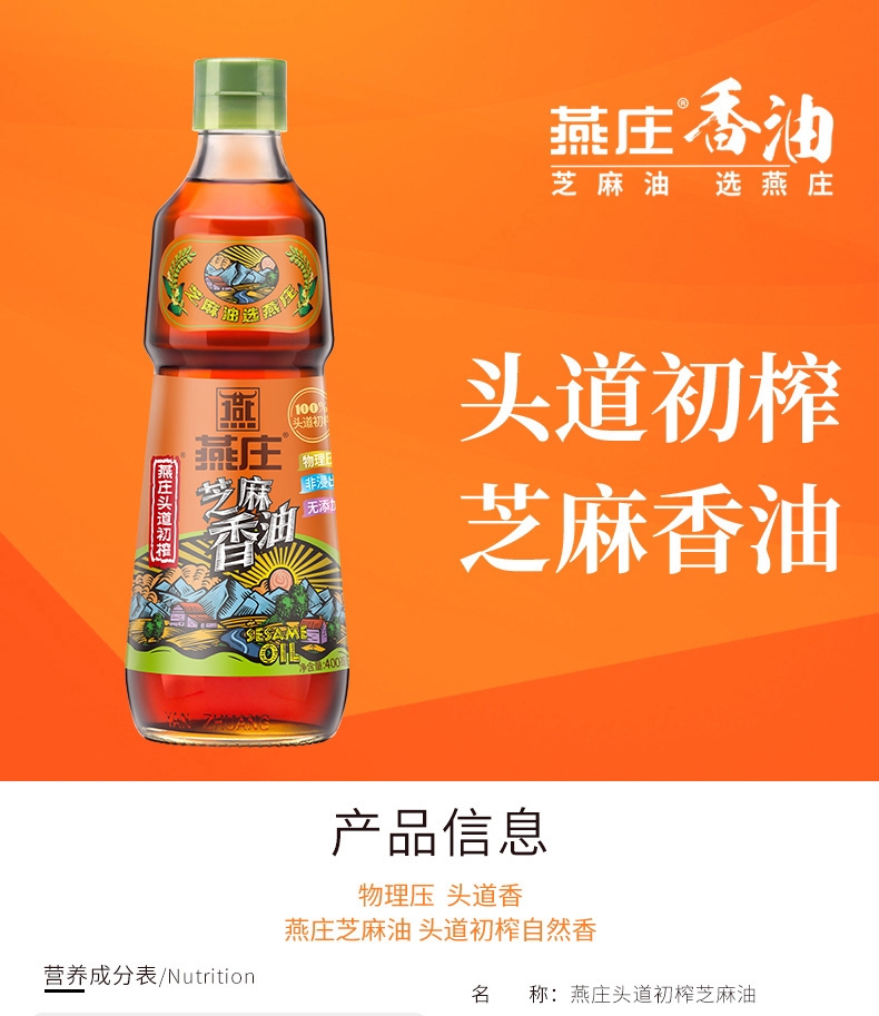 - 商品名称:燕庄 芝麻香油 头道初榨系列 纯芝麻压榨 凉拌调味蘸料 400ml