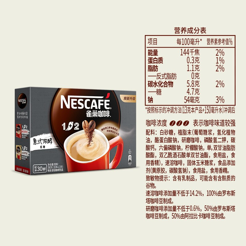 - 商品名称:雀巢(Nestle)速溶咖啡 1+2 特浓 微研磨 冲调饮品 30条390g (新老包装交替发货)