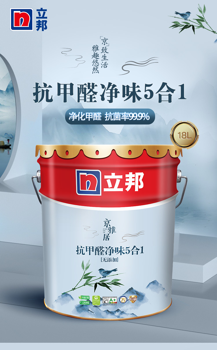 立邦乳胶漆 京雅居抗甲醛净味5合1无添加环保墙面漆油漆涂料内墙漆双倍防霉 18L