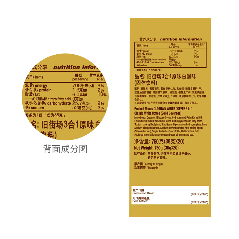 - 商品名称:马来西亚进口 旧街场(OLDTOWN)原味20条盒装 三合一速溶白咖啡 760g