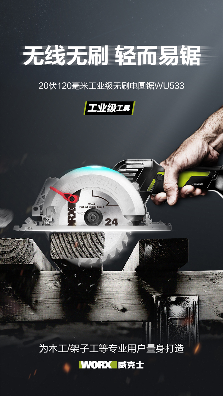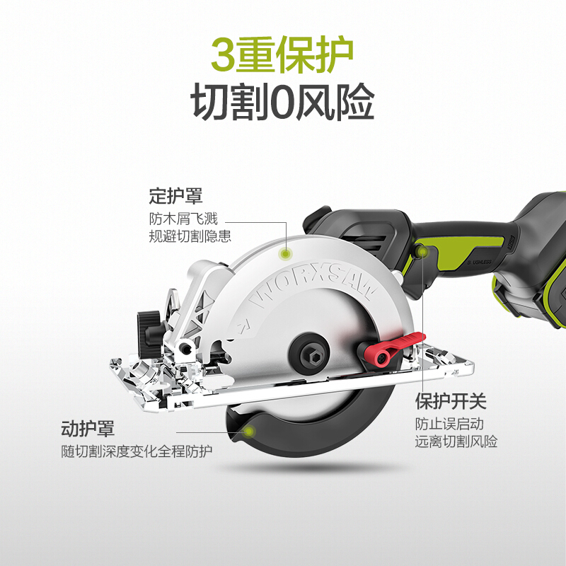 威克士(WORX)工业级无刷电圆锯WU533.9(不含电池) 充电式电锯圆锯电圆锯圆盘锯五金电动工具