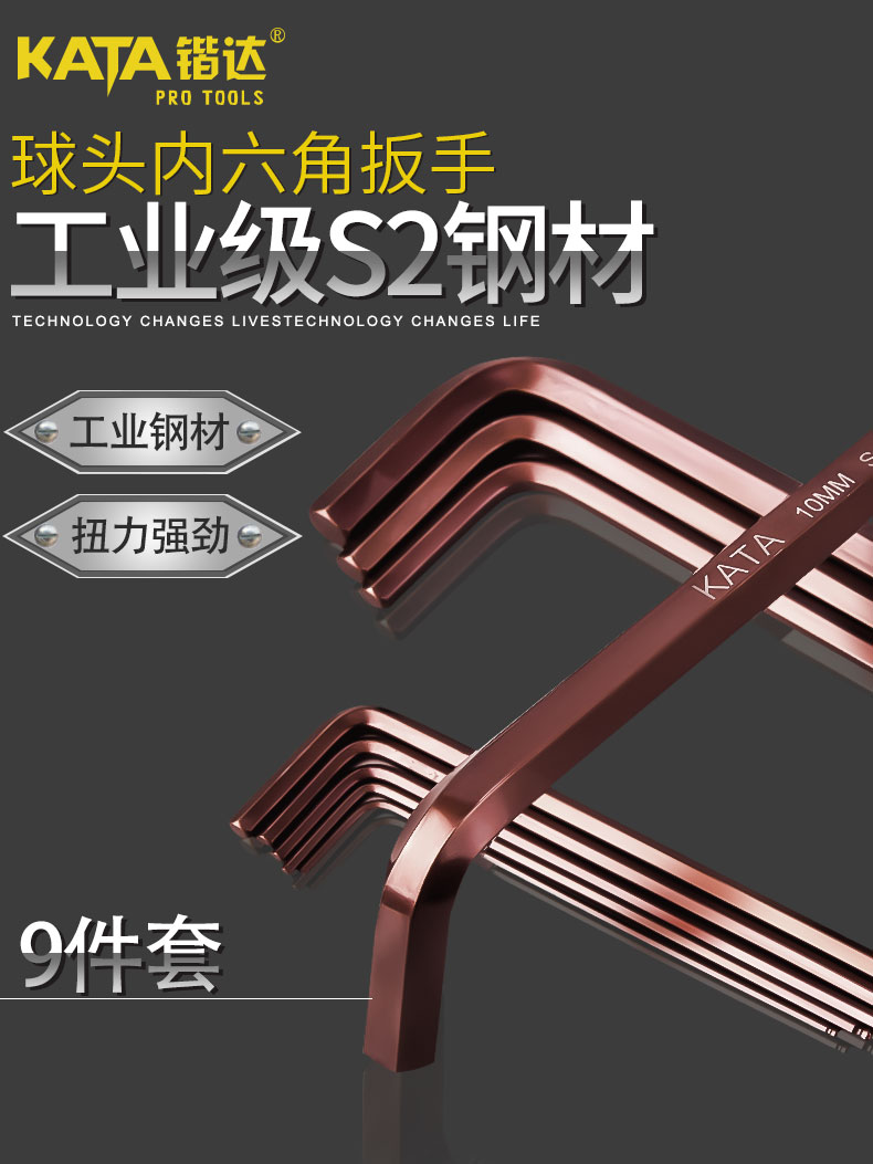 - 商品名称:锴达 KATA 内六角扳手9件球头内六角扳手套装中长内六角螺丝刀古铜色防锈S2 KT6001
