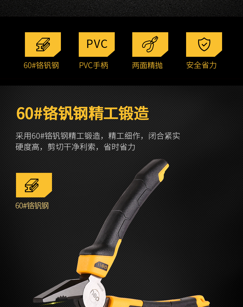 - 商品名称:得力(deli) 胶柄钢丝钳子60号铬钒钢老虎钳子多功能平口钳剪线钳8英寸 DL2008Z