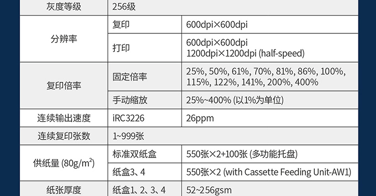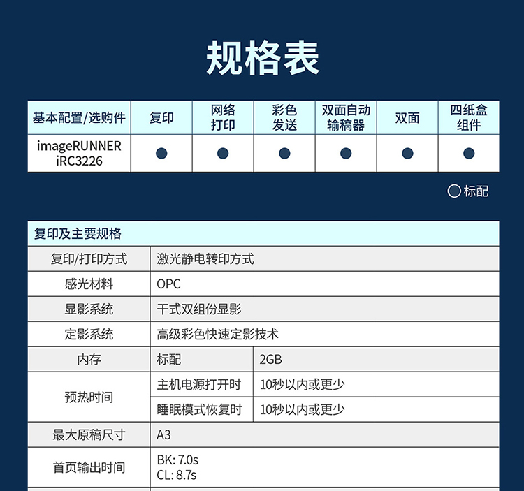 - 商品名称:佳能(Canon)复印机iRC3226 大型打印机a3a4复合机含输稿器+工作台(双面打印/复印/扫描/WiFi)3125升级款