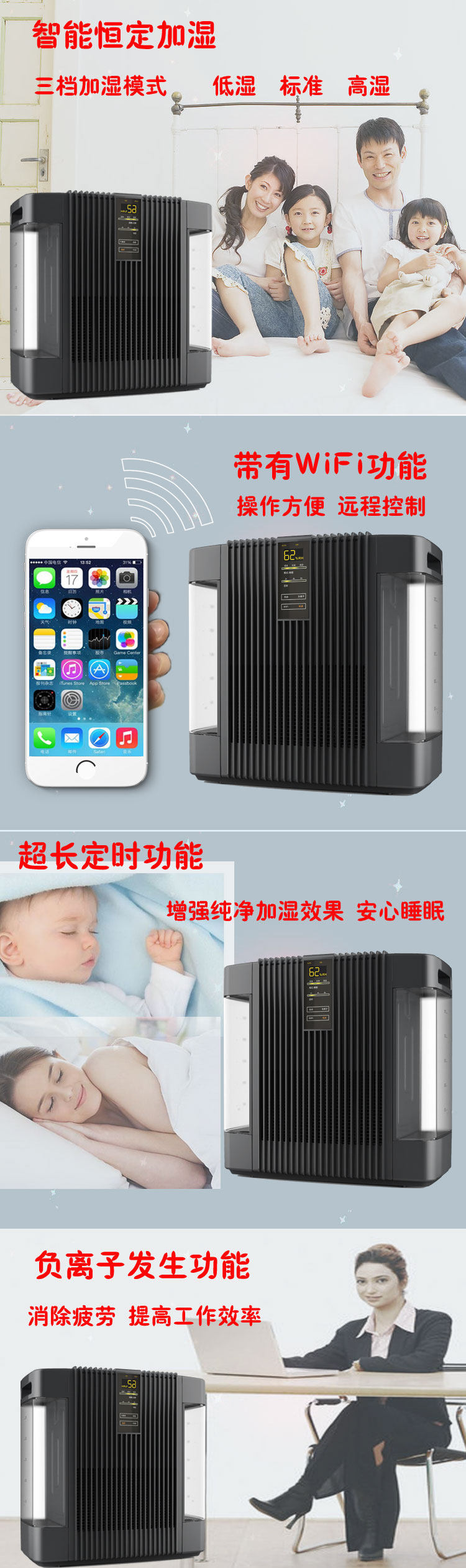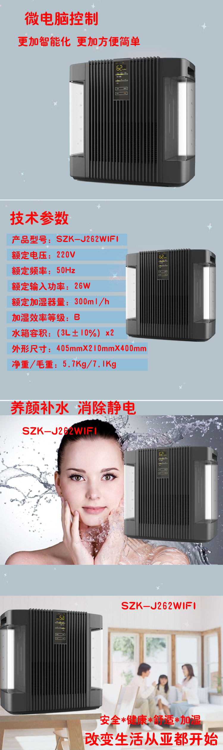 产品名称:YADU/亚都 SZK-J262WiFi 品牌: YADU/亚都 型号: SZK-J262WiFi 颜色分类: 黑色 加湿器分类: 加湿 适用对象: 家用 商用 适用面积: 41m^2 (含)-60m^2 (含) 功能: 负离子 纯净加湿 形状: 方型 电源方式: 交流电 水箱容量: 4.1L(含)-6L(含) 操作方式: 琴键式 出雾口数量: 其它 噪声: 36dB(含)-45dB(含) 是否支持定时功能: 支持 是否支持缺水断电保护: 支持 加湿方式: 不出雾