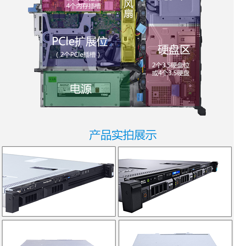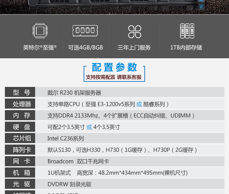 商品名称:戴尔 R230 机架式服务器(R230 E3-1220V6 4盘位 16G+1T*2 SAS+H330)