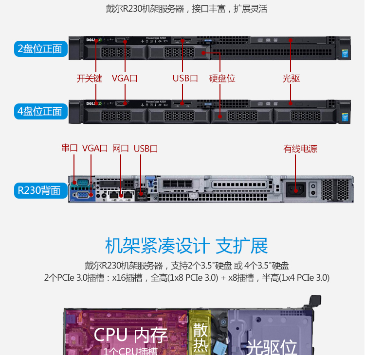 戴尔 R230 机架式服务器(R230 E3-1220V6 4盘位 16G+1T*2 SAS+H330)