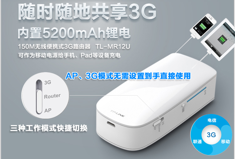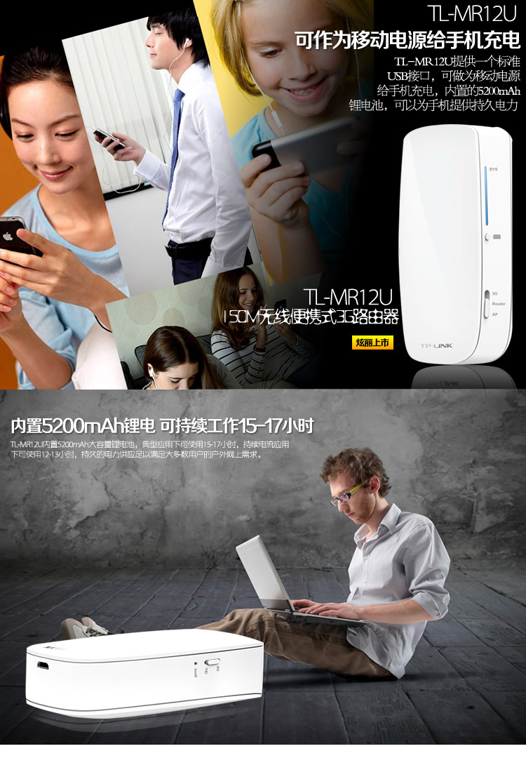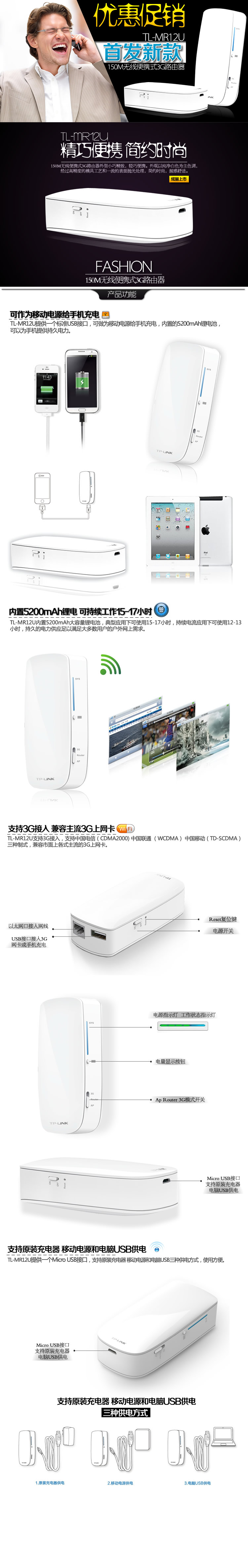 商品名称:TP-LINK TL-MR12U 3G无线路由器 内置可充电池 wifi移动电源