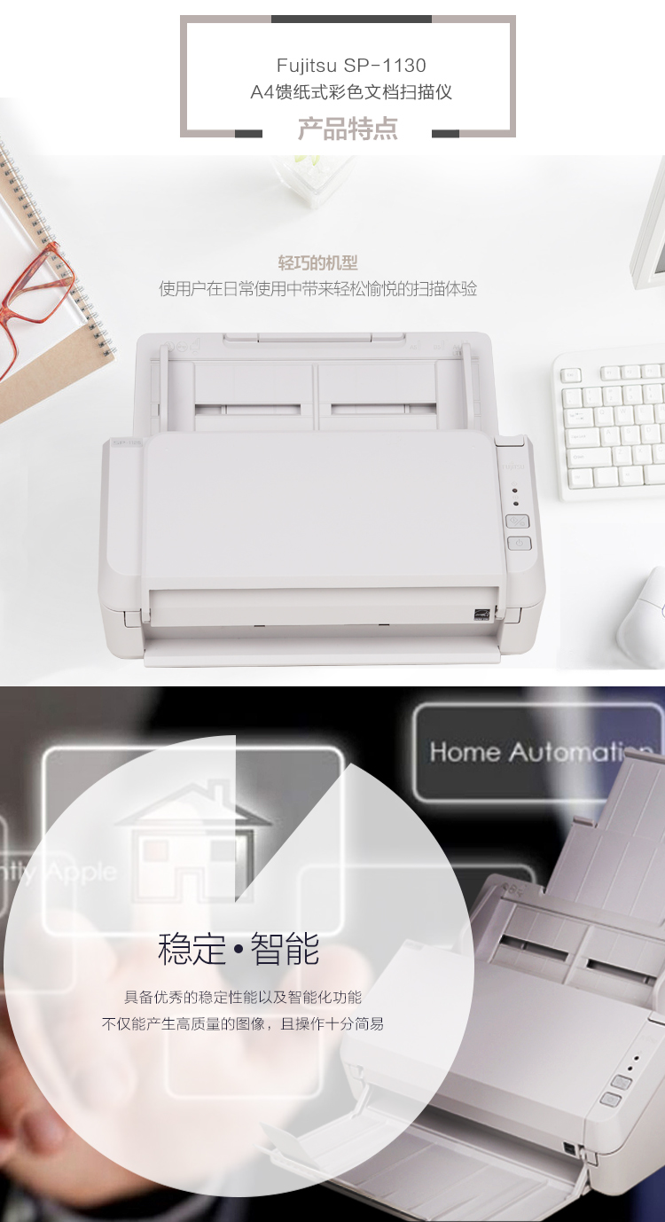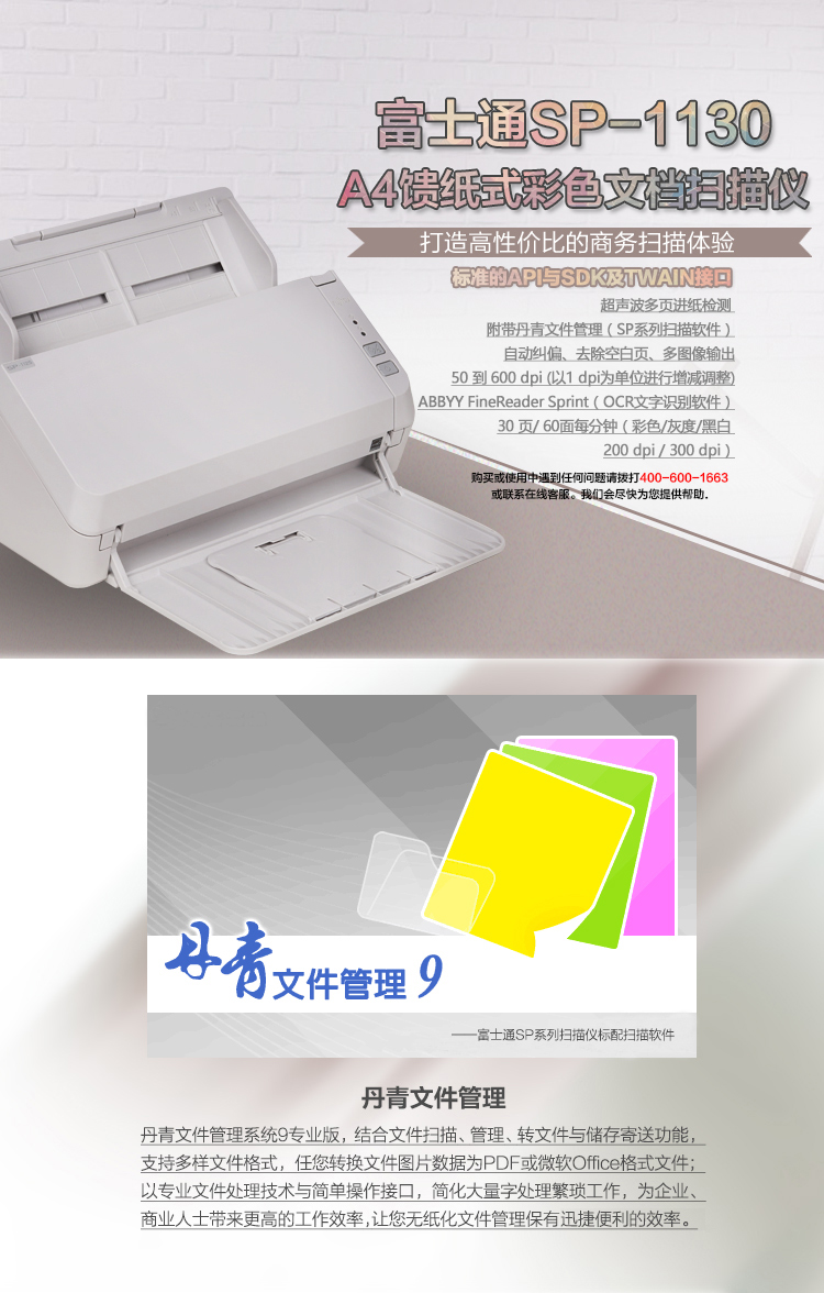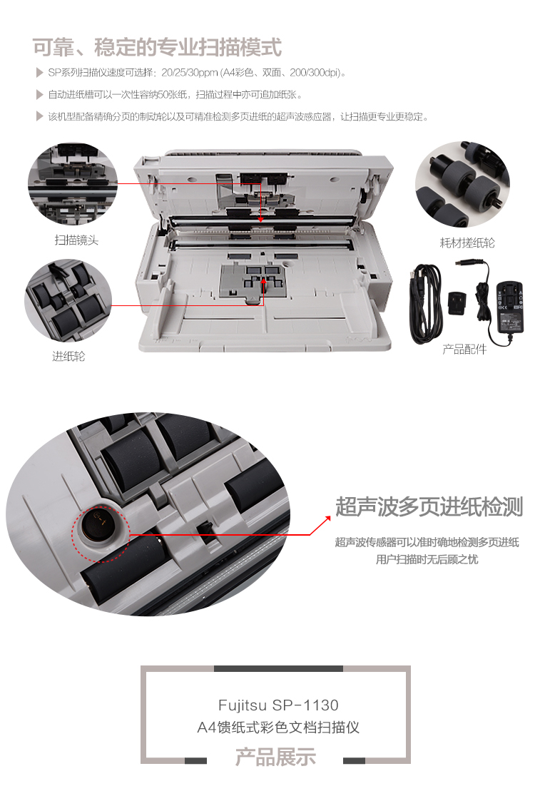商品名称:富士通(FUJITSU) SP-1130 扫描仪 A4幅面 速度30ppm/60ipm 色彩24位 分辨率600dpi 馈纸式 自动双面扫描