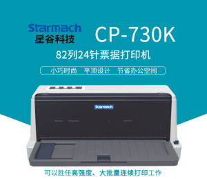 星谷CP-730K针式打印机 :82列平推针式、支持前进前出、前进后出、后进前出、1+6联、原装进口打印头、全钢机芯、全国三年保修