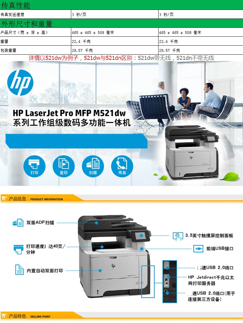 商品名称:惠普 LaserJet Pro M521dw 工作组级数码多功能一体机 (打印 复印 扫描 传真)