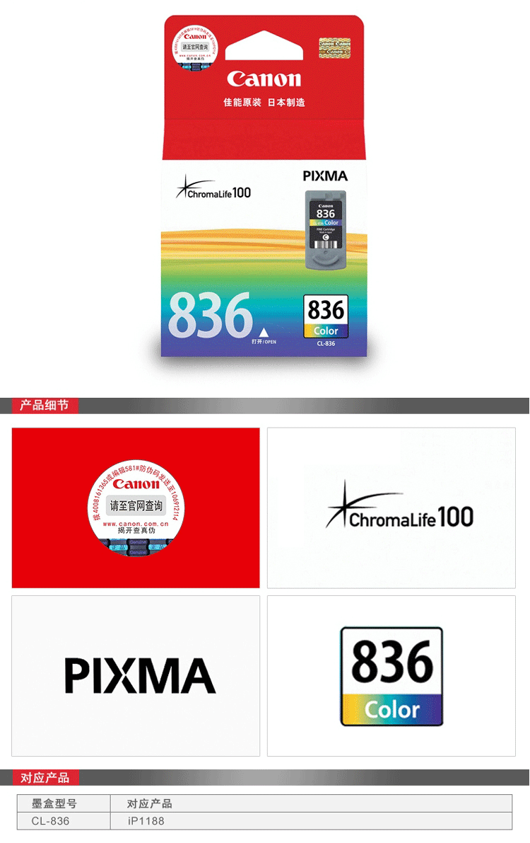 - 商品名称:佳能(Canon)CL-836(适用腾彩PIXMA iP1188)
