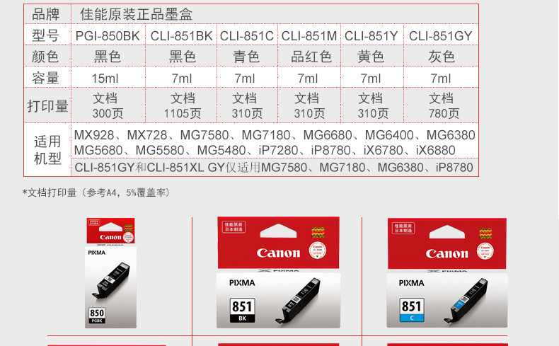 - 商品名称:佳能(Canon) CLI-851BK 黑色墨盒 (适用IP7280/MX728/928/IX6780/6880/MG6380/MG5480)