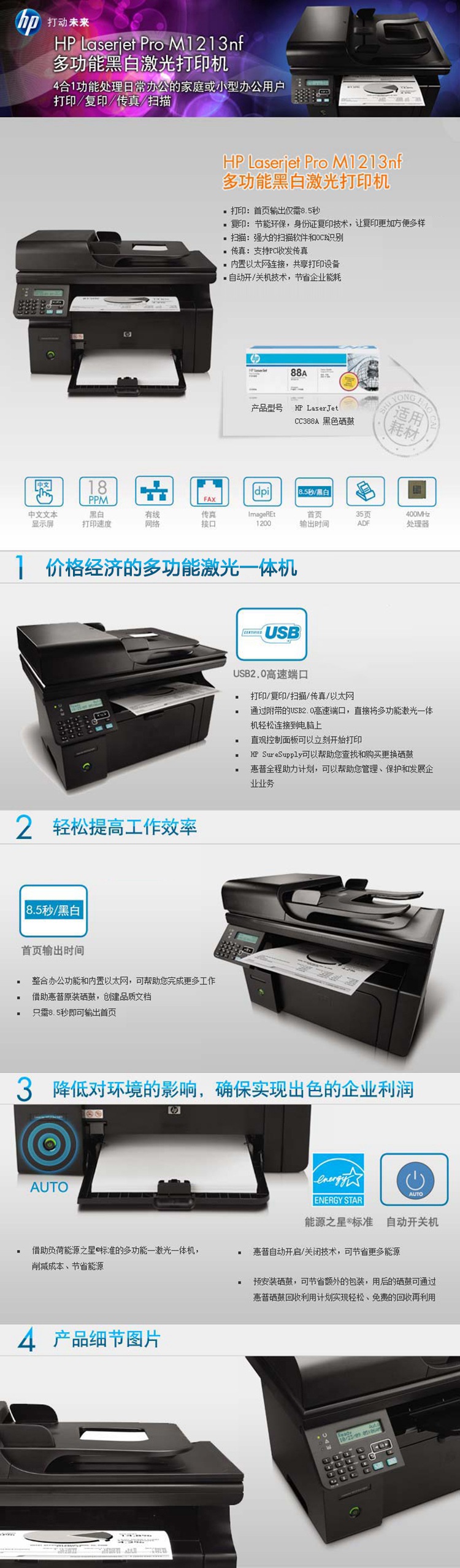 - 商品名称:惠普(HP) M1213NF 黑白多功能激光一体机