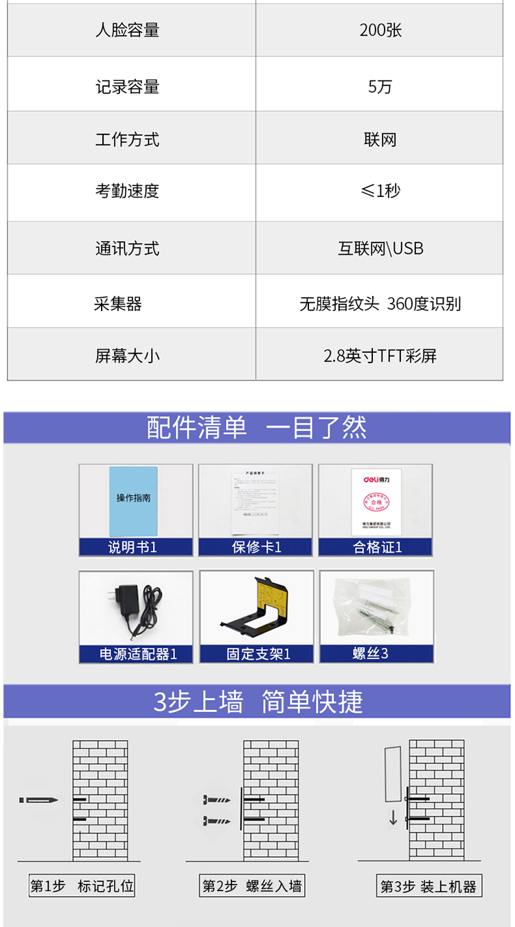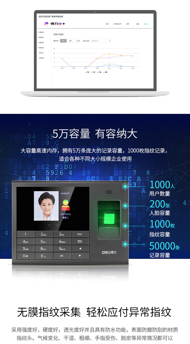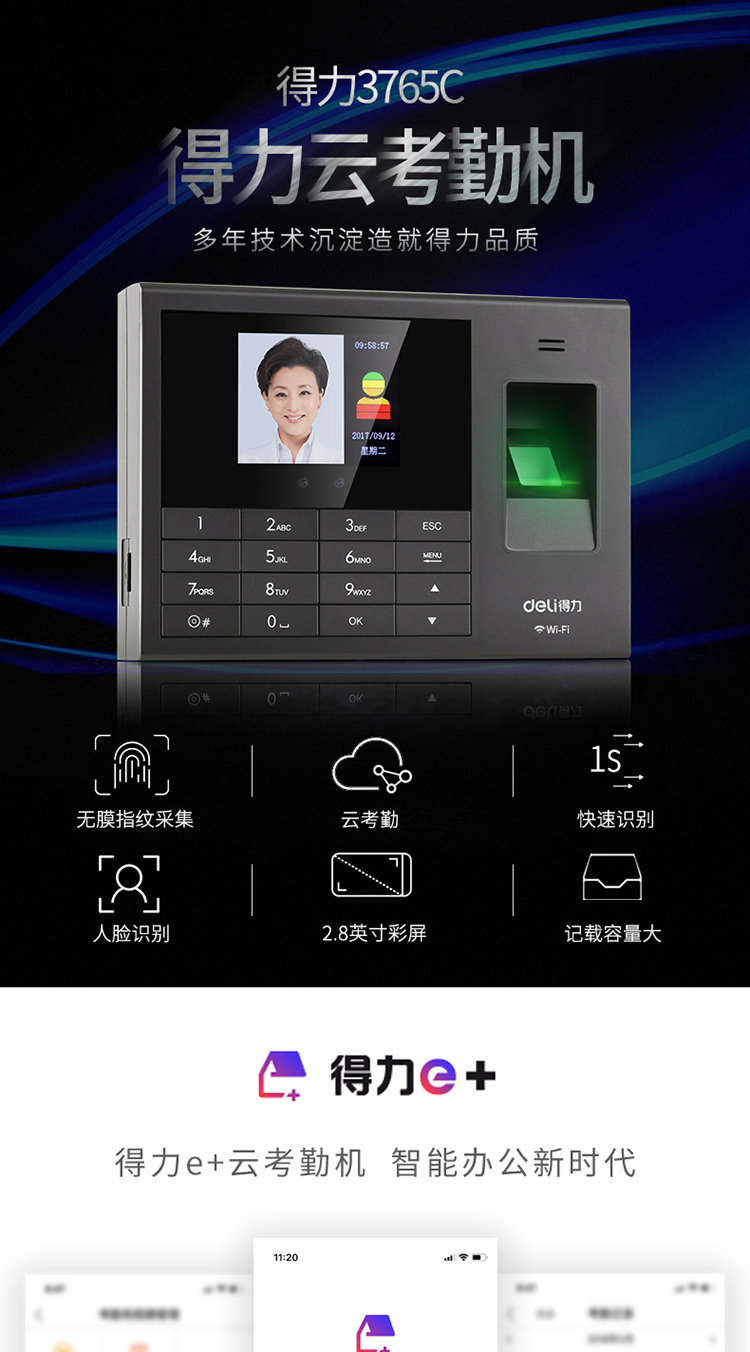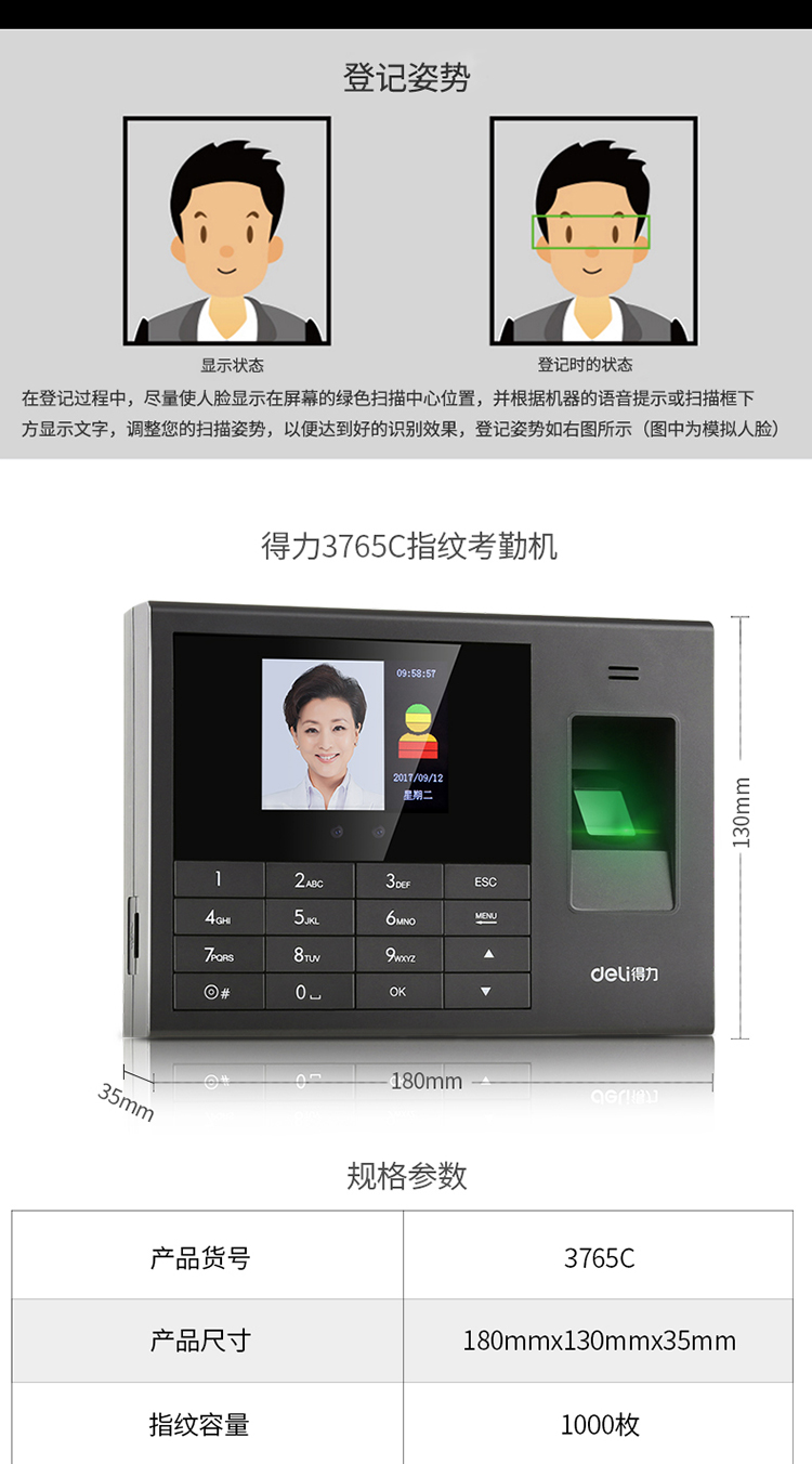 - 商品名称:得力(deli)3765C 智能云考勤机 人脸/指纹/手机定位打卡机