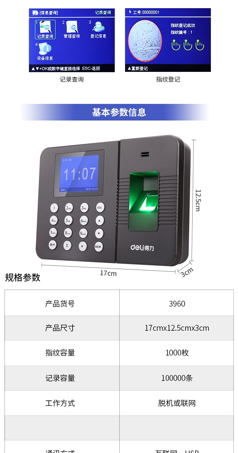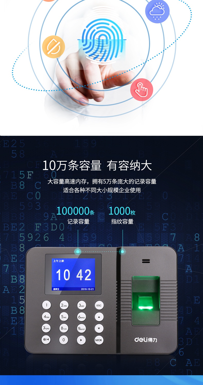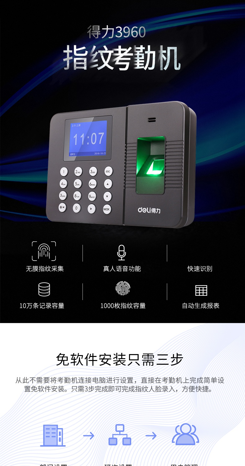 商品名称:得力(deli) 3960 指纹考勤机 指纹机 考勤 打卡机 签到机 打卡器 黑色3960