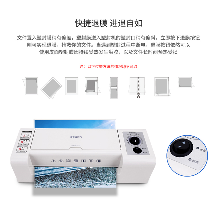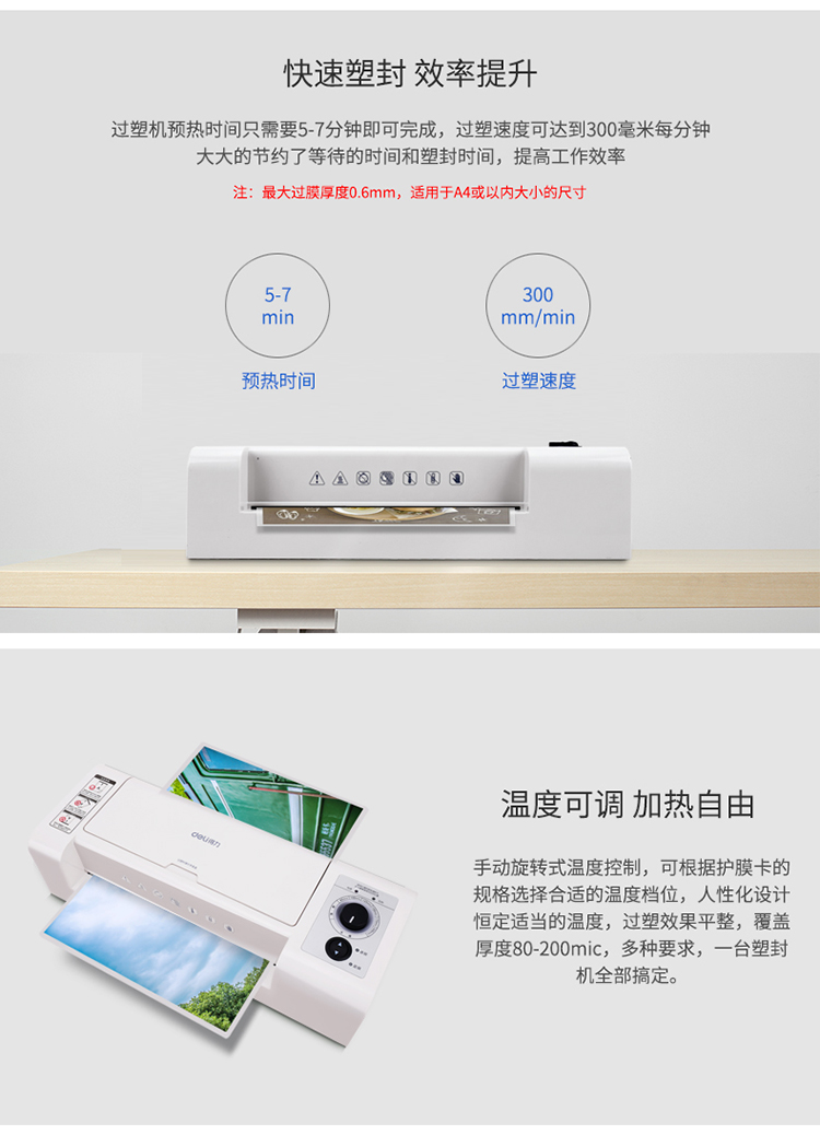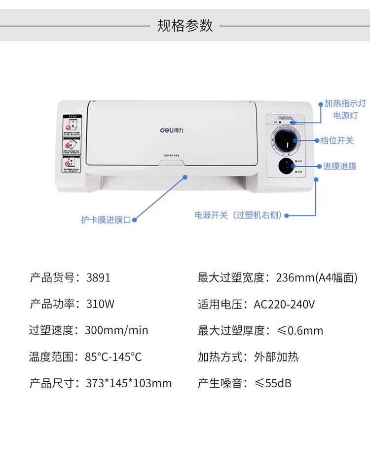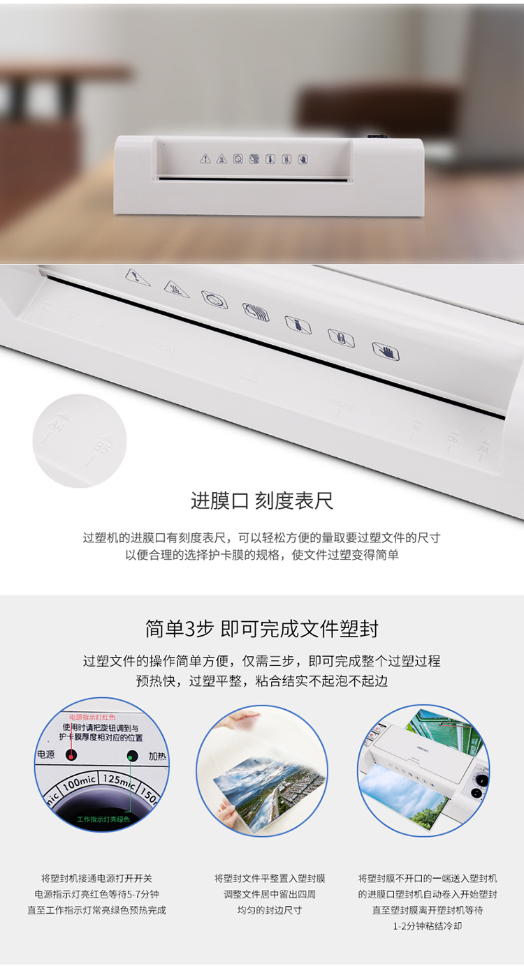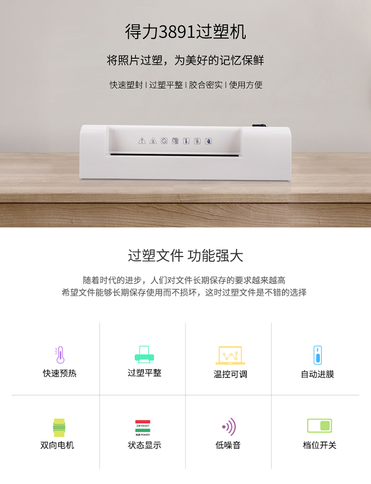 商品名称:得力(deli)3891 适用A4静音设计时尚简洁塑封机/过塑机 双向电机 灰色