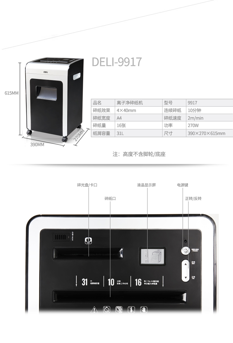 商品名称:得力(deli)9917多功能商务办公碎纸机 31L大容量 4级保密