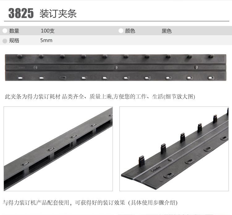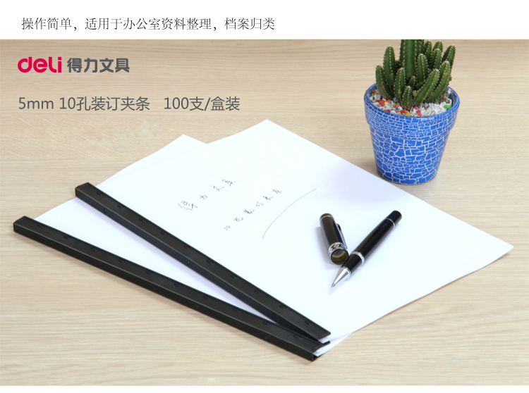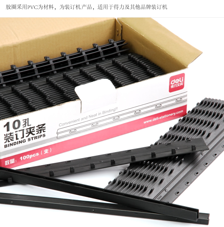 商品名称:得力(deli) 3827 10孔装订夹条 10mm 黑色 100支/盒装