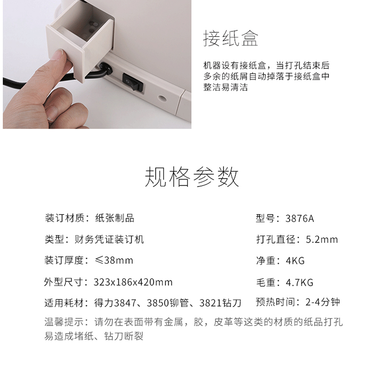 商品名称:得力(deli)3876A 经典财务凭证装订机 省力型档案打孔机 38mm 白色
